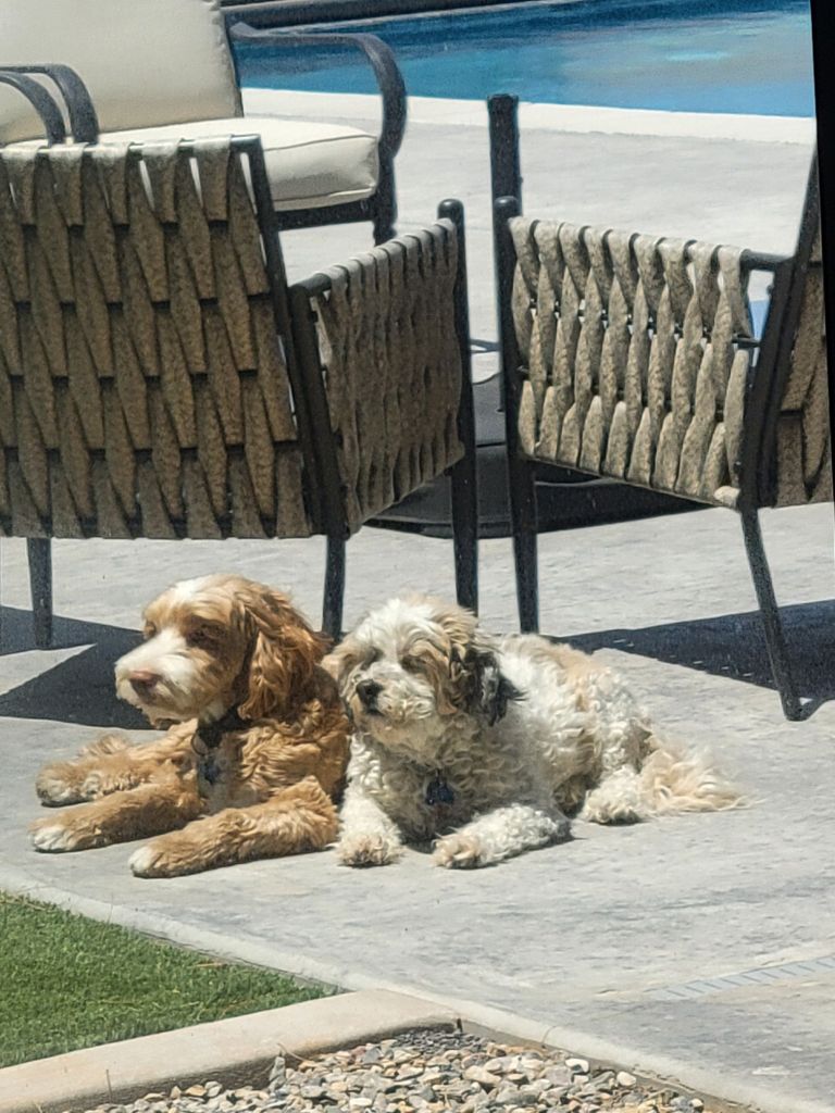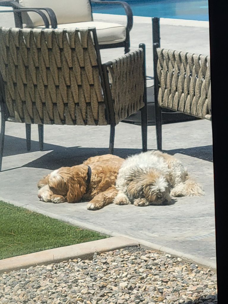These 2 are best friends! They play together, bark for fun at each other, take naps most of the day, get treats, have fresh water and food available at all times, and can lay out in the sun in 100+ degree weather and enjoy it!!! They also have multiple toys to play with, they receive tons of love and affection, and they are always happy to see you!